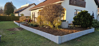 Unsere Leistungen: Entfernung der alten Holzpalisaden, Verdichtung des Untergrunds, Einsetzen der neuen Steinmauer mit Granitstelen